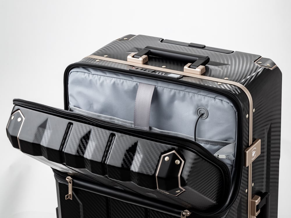 フロント部分の開閉部には、二重構造の防犯ファスナーを採用。ペンなどによるこじ開けを防ぎます。