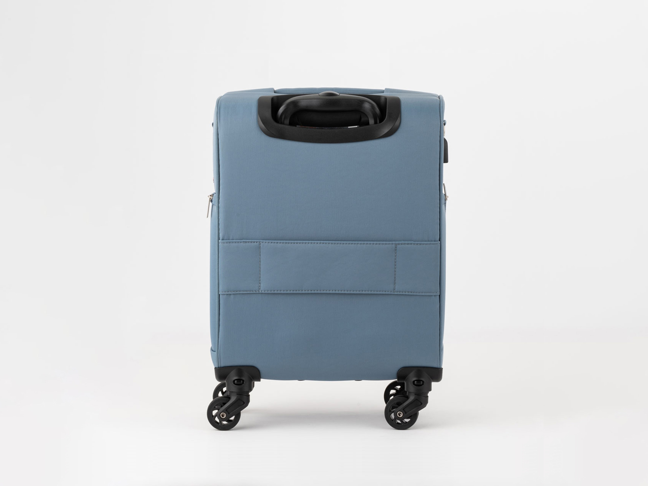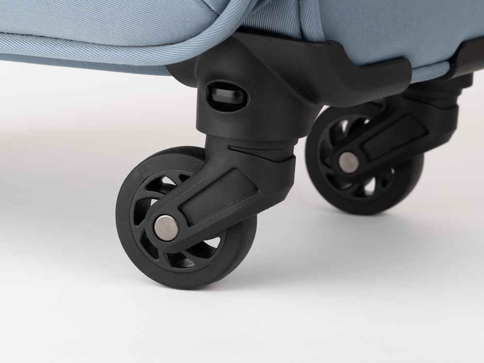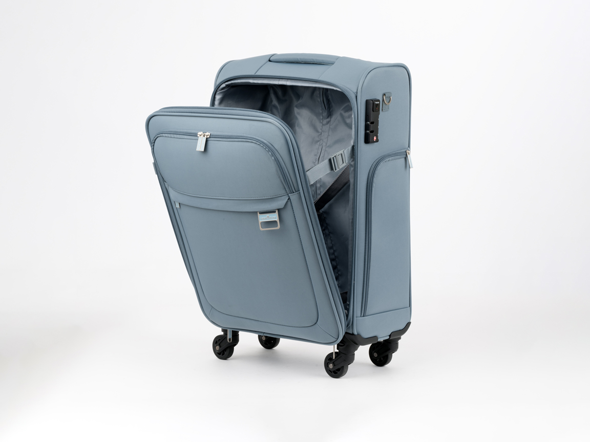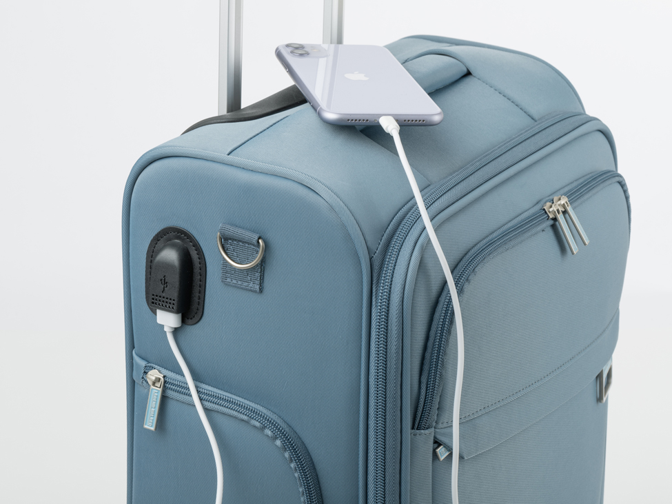 ワンタッチボタン式で簡単にキャスターを取り外してコインロッカーや機内持ち込みサイズに対応。USBポートやショルダーベルトなども装備した柔らかな色合いのソフトキャリー。