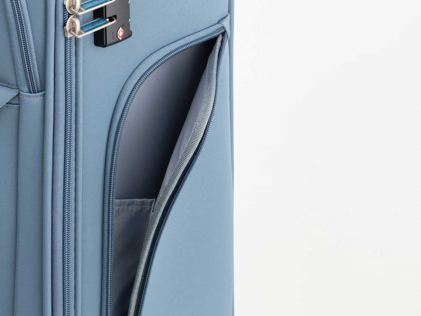 両サイドには撥水加工を施したポケットを装備。濡れた傘や取り外したキャスターを収納するのに便利です。