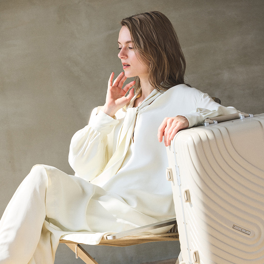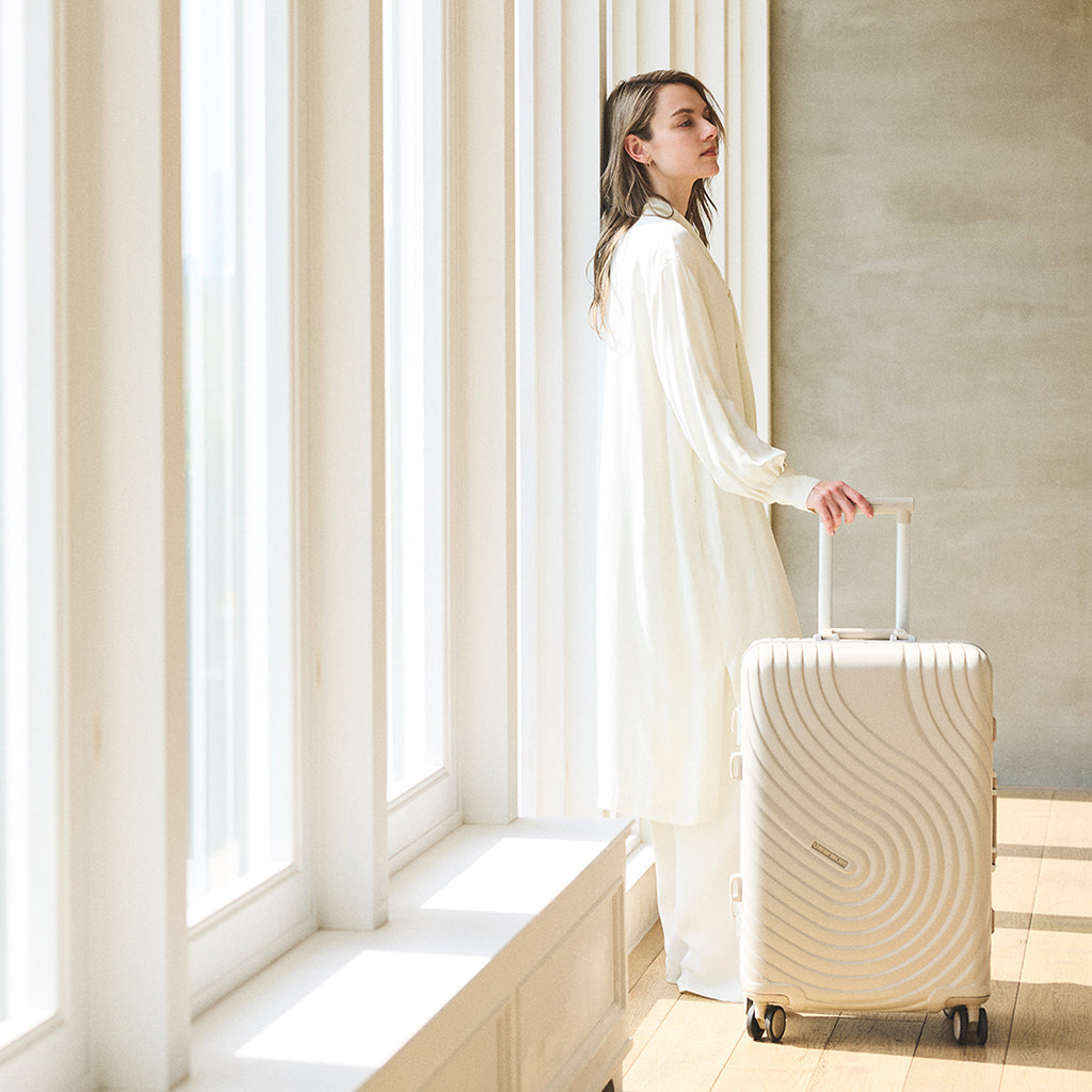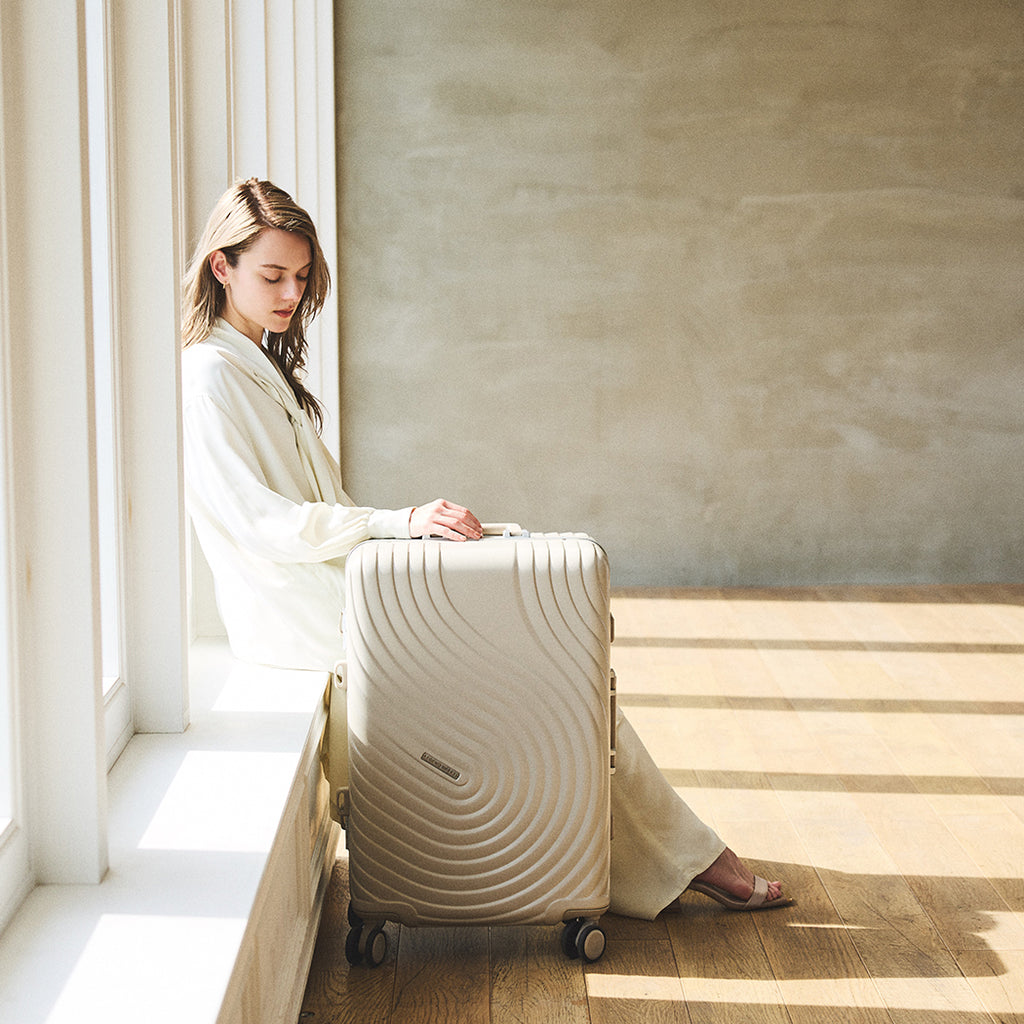 枯山水の渦紋をモチーフにしたデザインと、開閉部はスタイリッシュなスリムフレームを採用。日乃本錠前社製ダブルキャスターで静音かつ軽快な走行を実現。