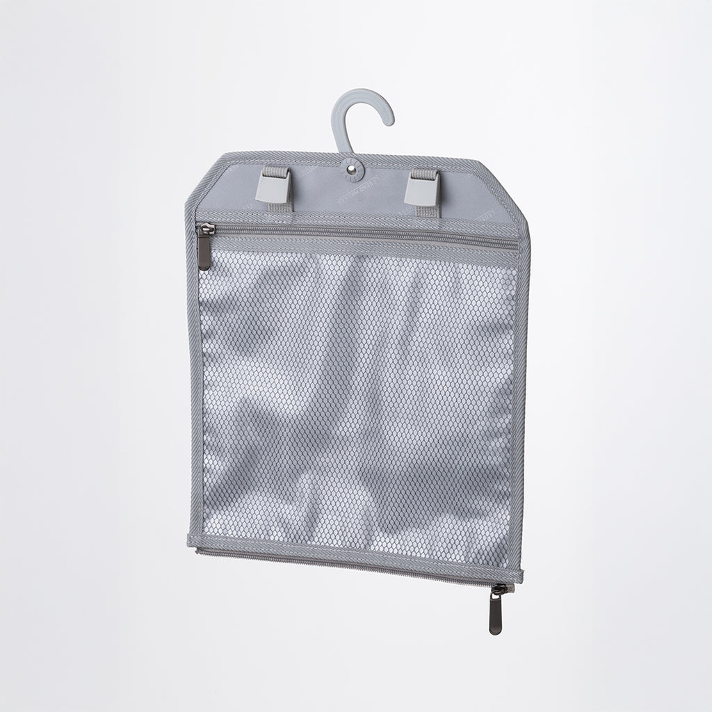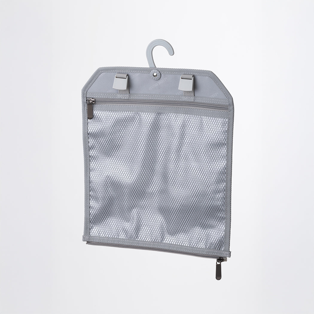 撥水ポケット付きの仕切り下部はファスナーで取り外し可能。フック付きなので洗面所やハンガーラックに掛けて使用できます。