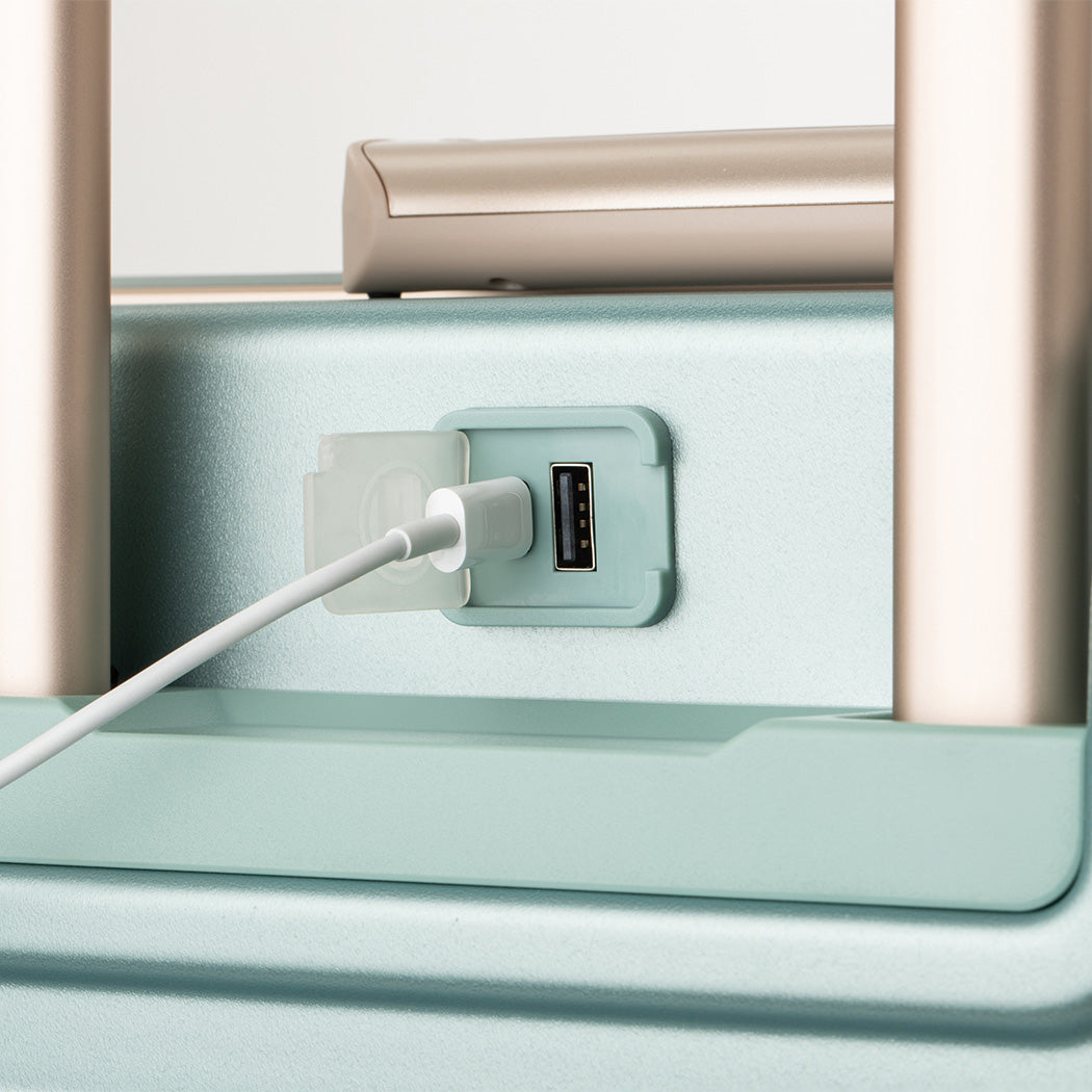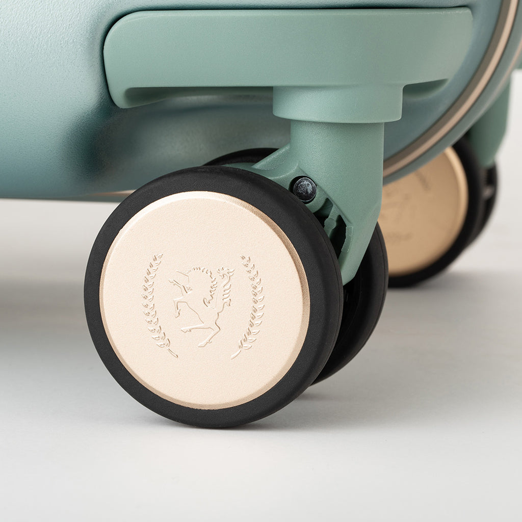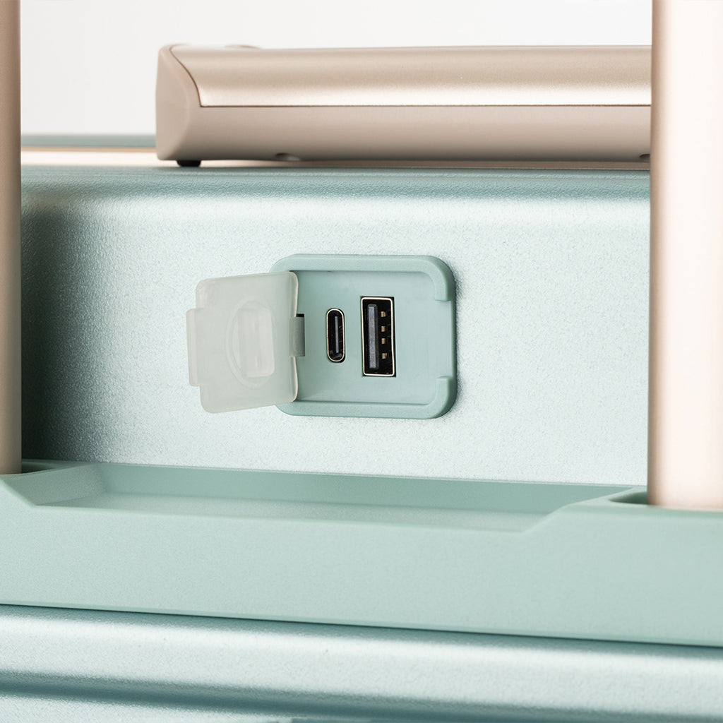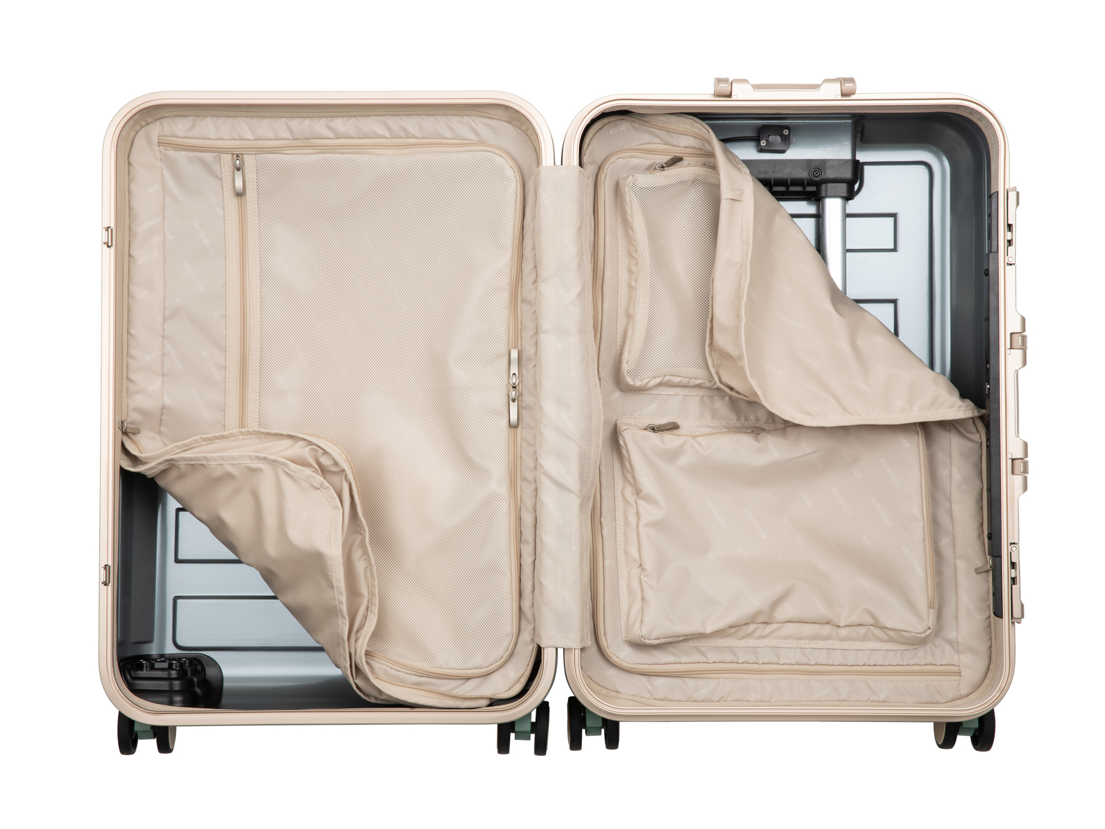 滑らかな走行と静音性を備えた独自開発のストッパー付きキャスター搭載。外して丸洗いできる内装、スマホスタンドやUSBポートも搭載した多機能モデル。