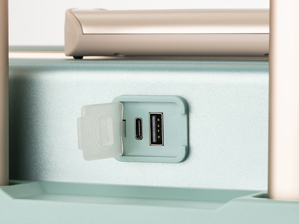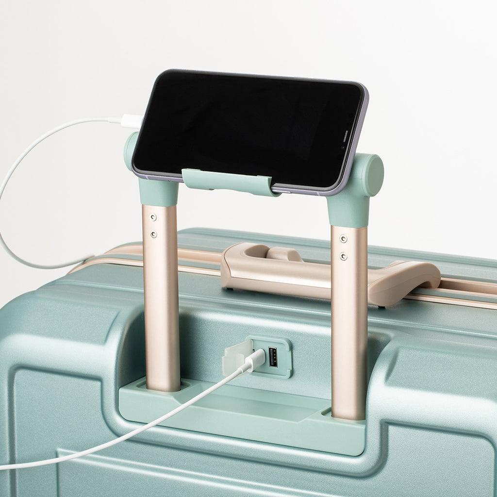 滑らかな走行と静音性を備えた独自開発のストッパー付きキャスター搭載。外して丸洗いできる内装、スマホスタンドやUSBポートも搭載した多機能モデル。